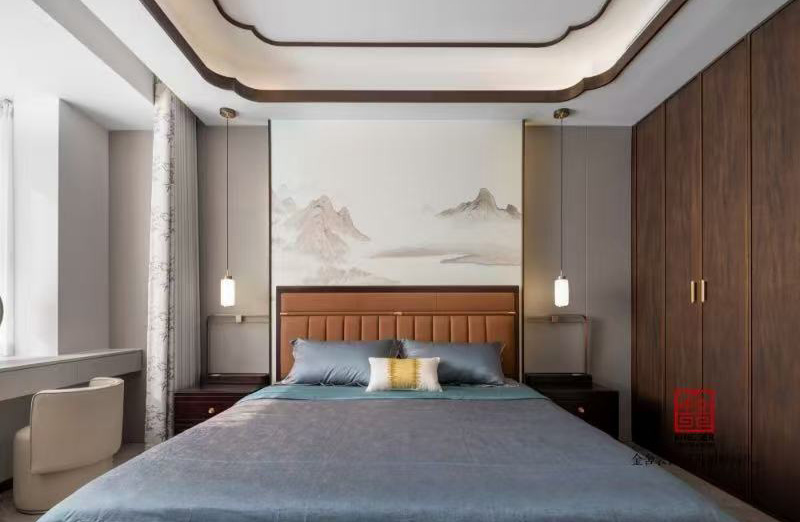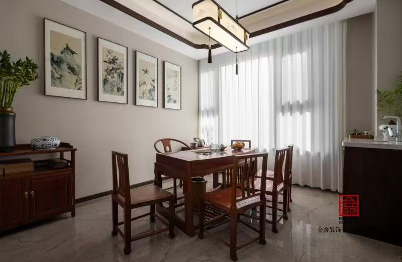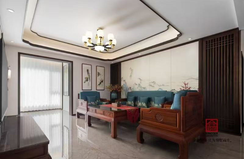 原木與傳統花格裝飾,盡顯中式風情。空間布局巧妙,功能區互不干擾,動靜分離。錯層高差處,兼具實用與美觀。