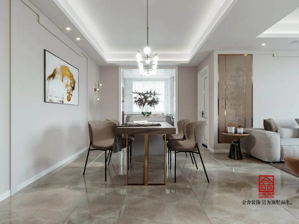 干凈明亮的餐廳空間借由藝術特質,有著一氣呵成的輕奢氣派,石材、布藝及金屬等多樣的材質運用使得空間靈動而不失活潑。