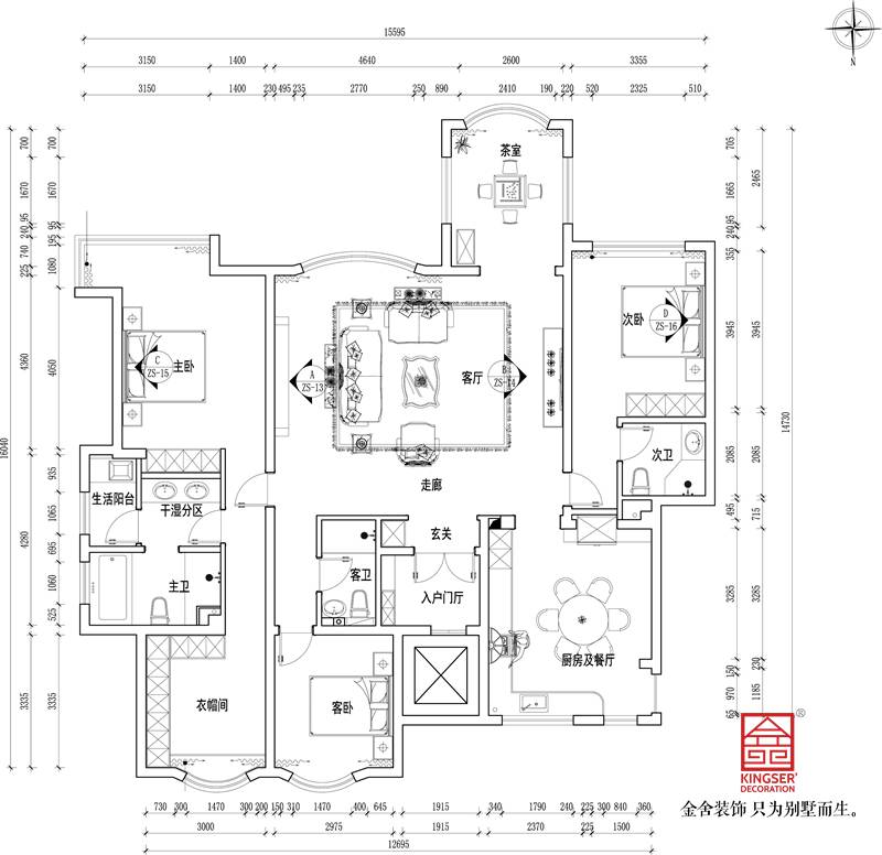 2、主臥室將兩個空間合二為一,變成臥室衣帽間及衛生間一體化,功能齊全,體現了主臥空間的舒適性。