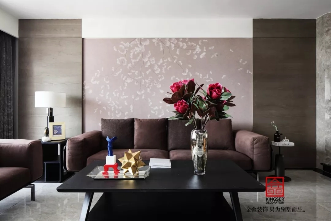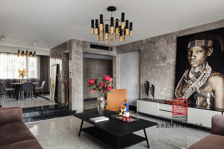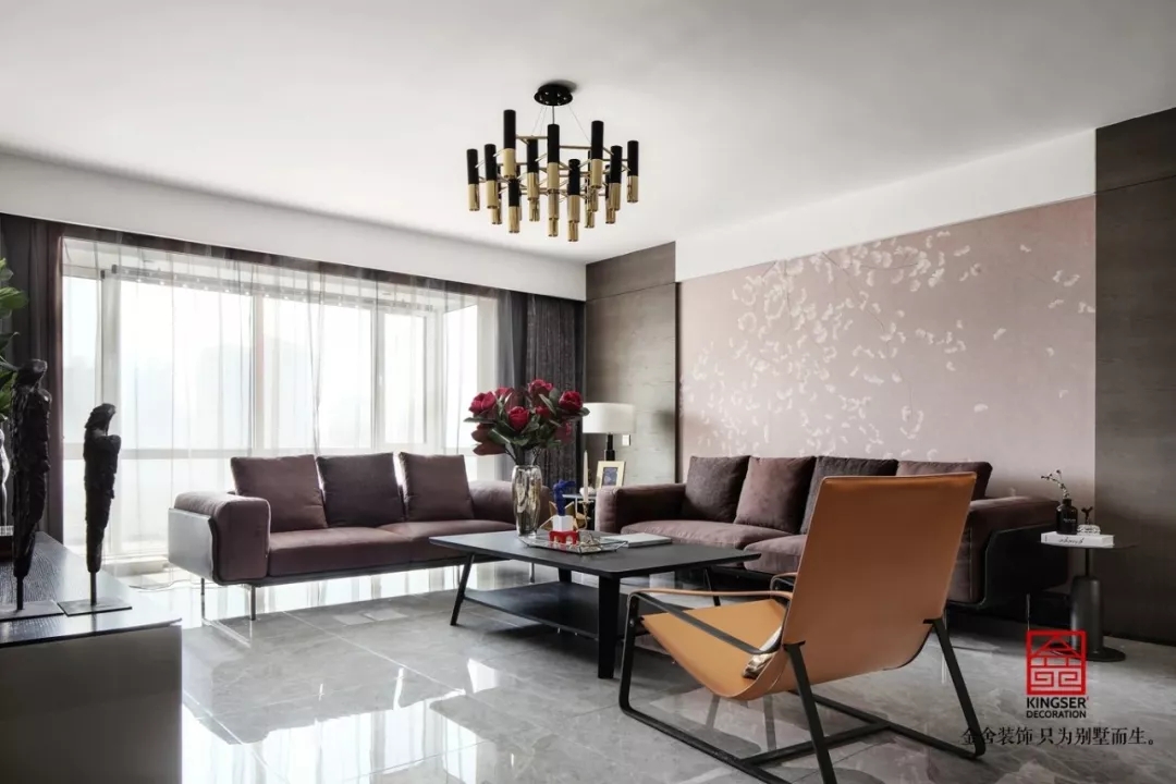 深灰色石材墻面質感一流,細看之下,絲絲細紋應和著大理石紋理的律動感,貴雅不張揚。搭配造型極簡的黑色茶幾與金黑色現代造型的吊燈,極簡之風呼之欲出。于精致的高級灰色空間中,深咖色的沙發越發跳脫,令空間質感十足,魅力爆棚。