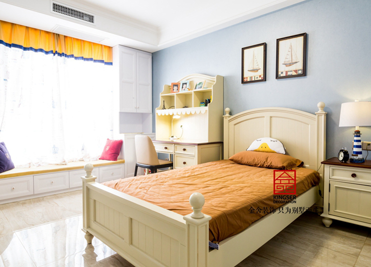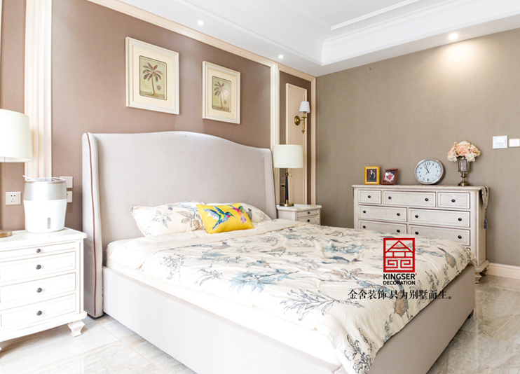 寬敞的主臥空間,樸素的壁紙,金色的窗簾,伴隨著溫暖的陽光,帶來和諧的效果。有時清澈典雅,有時溫柔宜人。夏天的家有這種優雅的氣息,臥室的角落都說明了美國家的自由。