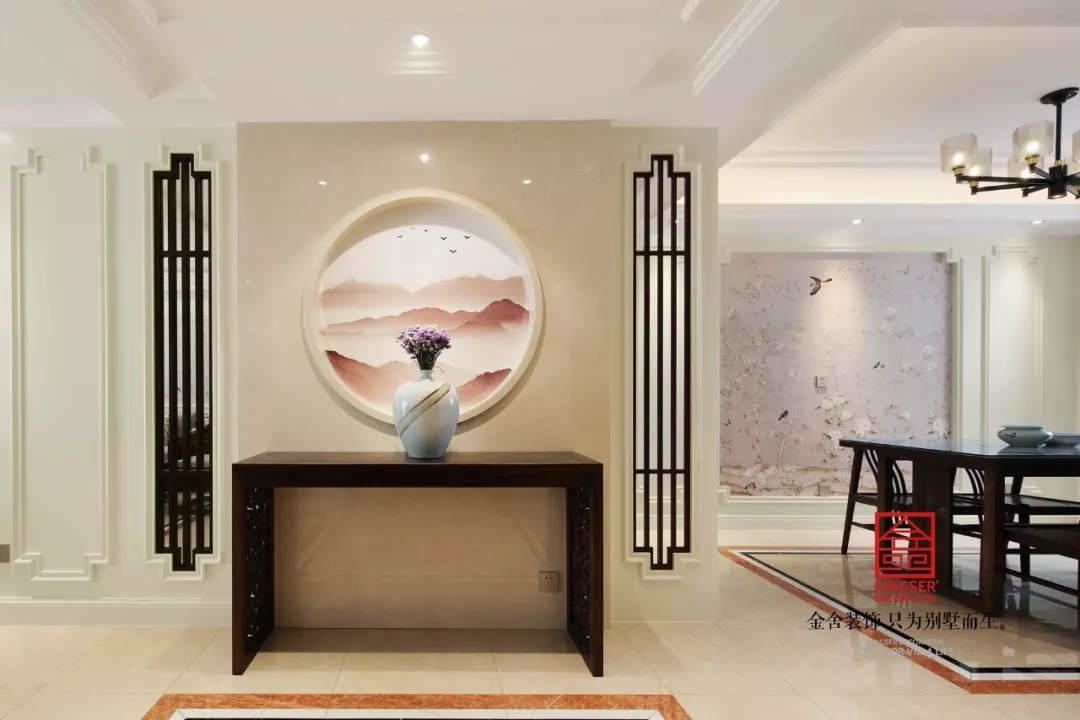 玄關(guān)走廊淡素色墻面,質(zhì)感簡(jiǎn)單又沉穩(wěn)、原始又兼具現(xiàn)代感,圓形的窗棱感覺(jué)與水墨風(fēng)的壁布融為一體,即凸顯出中式風(fēng)的特色,又形成色調(diào)上濃淡界限,增加空間層次。兩邊的木質(zhì)窗棱簡(jiǎn)潔樸質(zhì),頂面的射燈映背景墻,為樸厚空間注入柔美與雅韻。