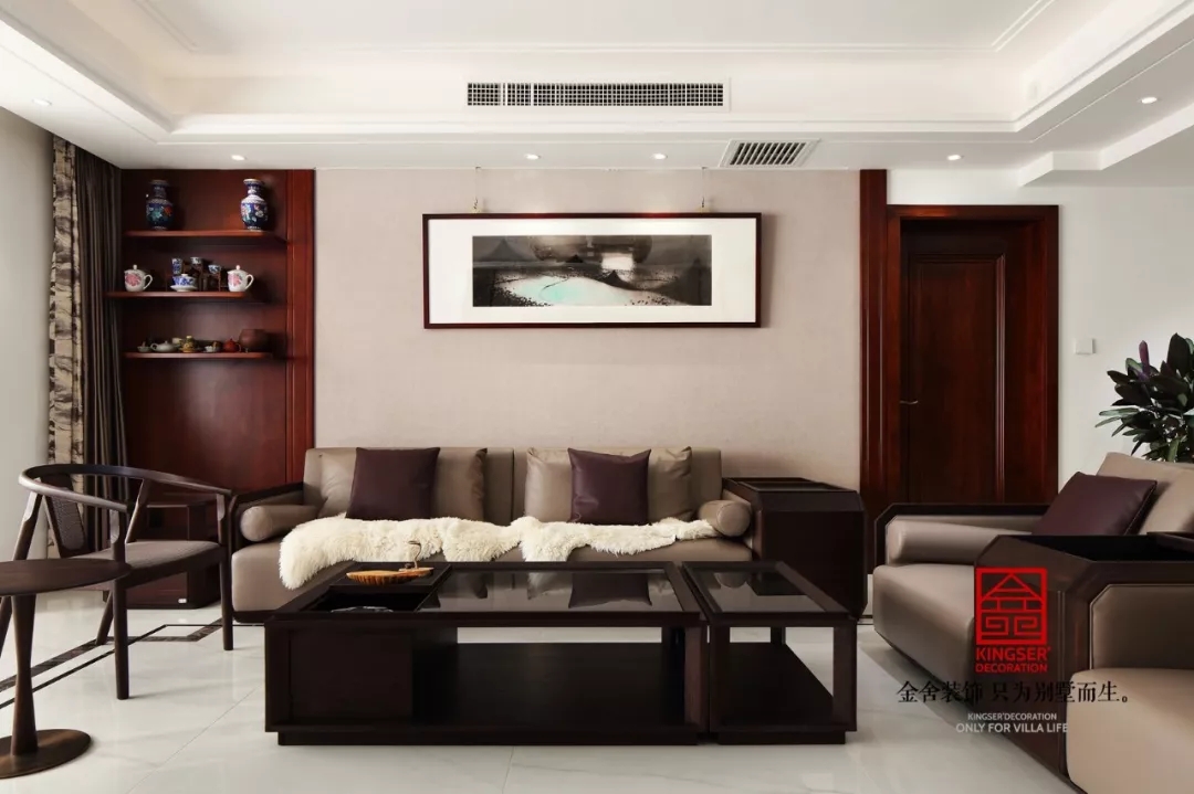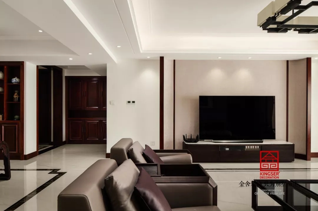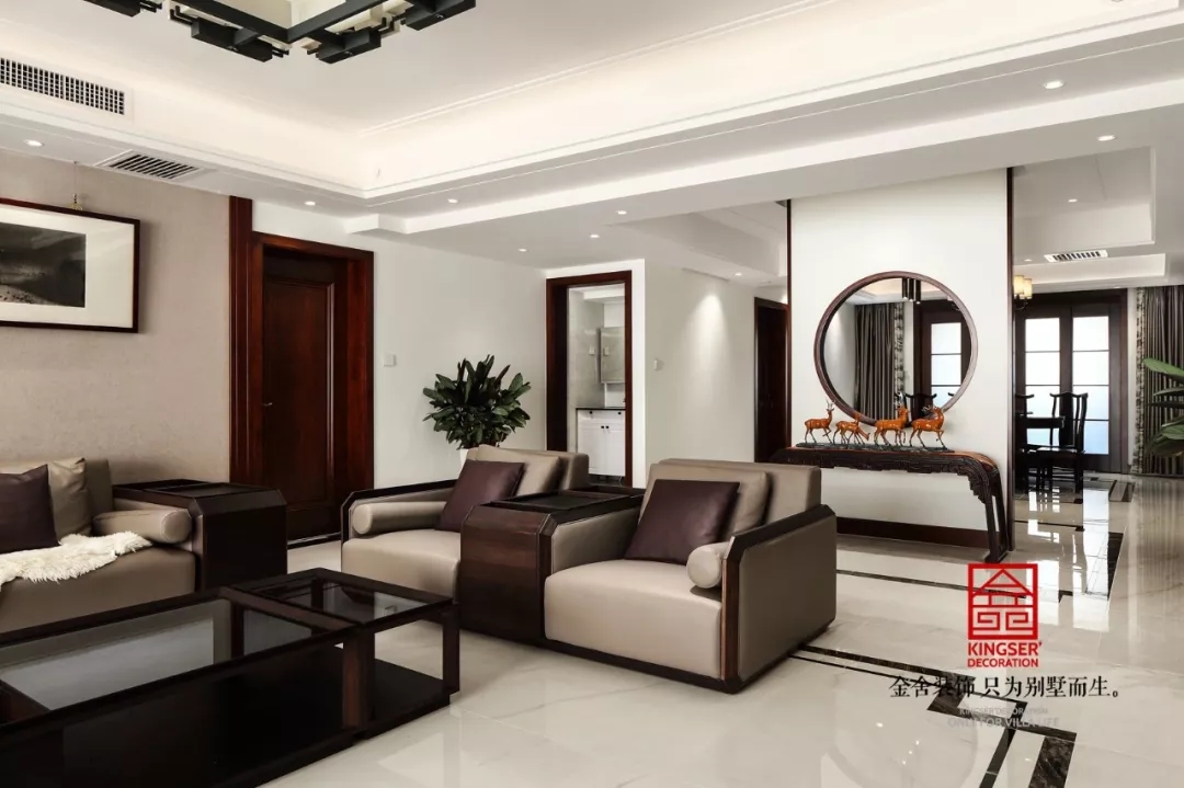 客廳是傳統與現代居室風格的碰撞,以現代的裝飾手法和家具,結合古典中式的裝飾元素,來呈現亦古亦今的空間氛圍。中式風格的古色古香與現代風格的簡單素雅自然銜接,使生活的實用性和對傳統文化的追求同時得到了滿足。