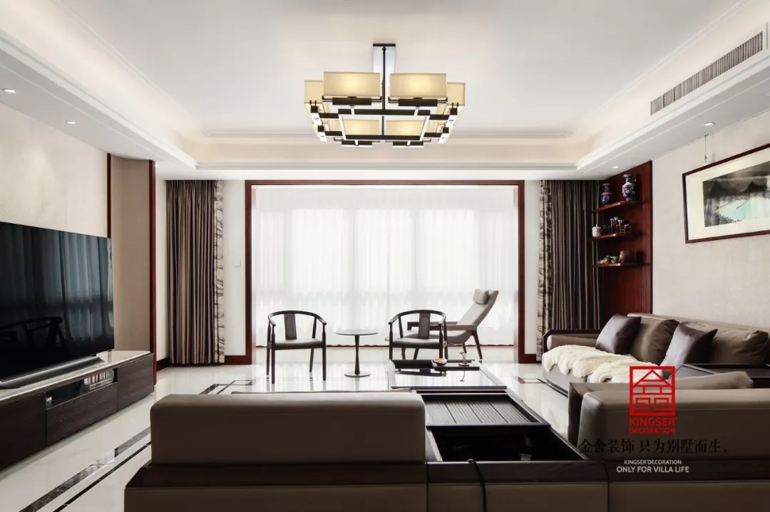 本案例為石家莊金舍裝飾-正定小區206平米中式風格裝修實景。定位新中式風格,客戶要求簡單、時尚,輕裝修重裝飾,體現現代人的生活模式的同時可以蘊含中國東方儒雅氣度。在家具形態上更加簡潔清秀,空間配色上也更為輕松自然。