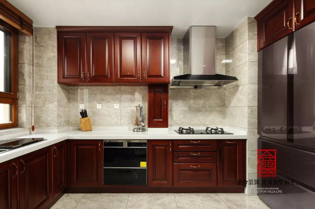 紅木色的櫥柜與雙開門的冰箱仿佛隔絕了廳外的歷史滄桑感,走向一個現代感極強的家居,讓整個廚房更加的便利融洽。