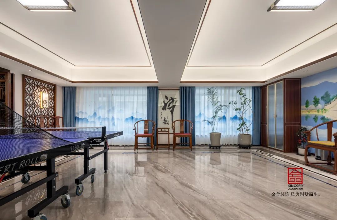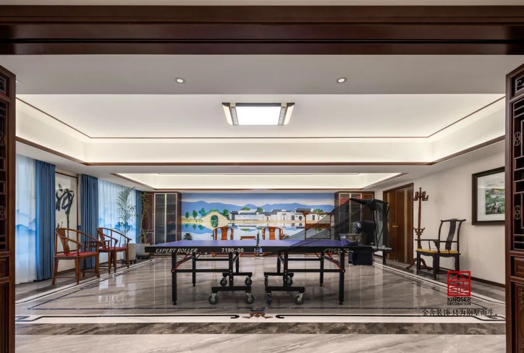 一個(gè)家居會(huì)所最不能缺少的就是娛樂的空間,乒乓球臺(tái)和影音室,晨沐朝霞、夜觀星斗,總有人想要脫開繁復(fù)的人事交集,體味中式元素之廣博。