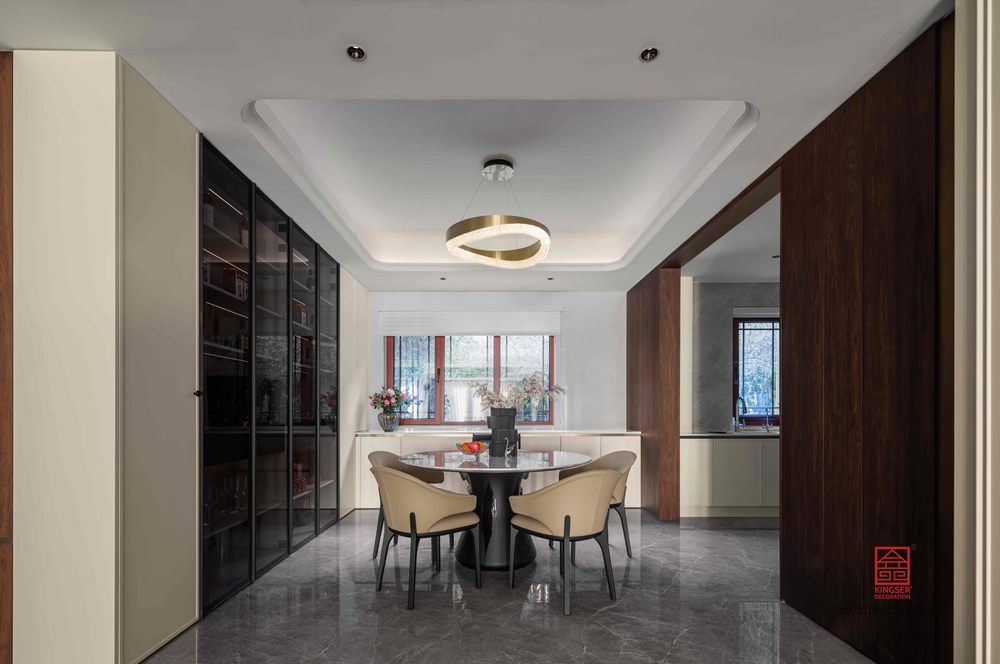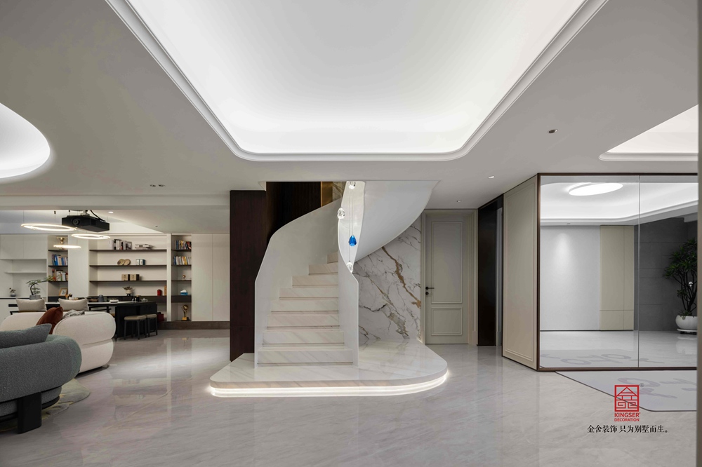 褪去城市繁冗華麗的外殼,回歸至與人的內在共鳴,斑駁的光影在客廳空間徜徉,大理石與墻板的搭配,釋放出一種優雅、沉靜及治愈的氛圍感,貫穿于整個別墅裝修空間的動線。