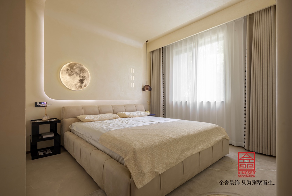 負二樓的臥室是客房,淺木家具配米白加金色床品,透著溫潤感。飄窗邊設陽光區,擺著幾個抱枕,夜晚枕著柔和燈光,能給來客一份歸家般的安穩。