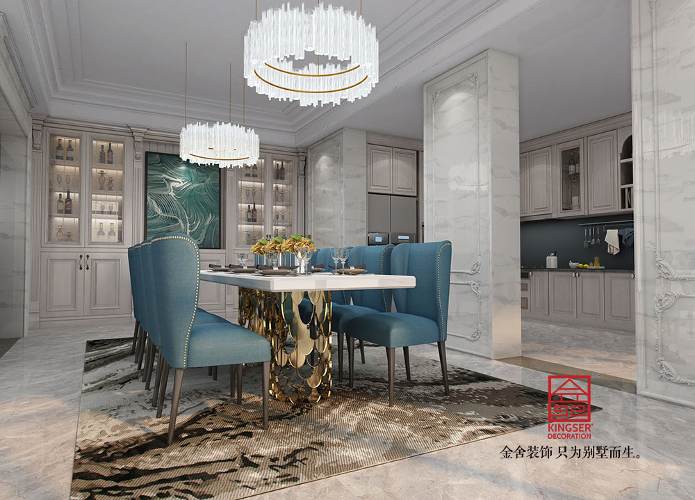 設計說明:此案例為石家莊金舍裝飾-西山御園700平米歐式風格裝修效果圖本次設計在空間上徹底打破了原始的格局規劃,重新在表現形式上推陳出新;拋棄了原先以墻面裝飾為主的傳統設計手法,反而從結構本身出發,大膽采用“無框設計”和“重點設計”,利用不同材質的搭配營造出一種浪漫的、高貴的、典雅的家居空間。