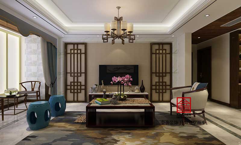 在室內裝飾設計搭配上,以沉穩的深色調為主搭配藍色紅色等亮色形成對比,表達對清雅含蓄、端莊豐華的東方式精神境界的追求。
