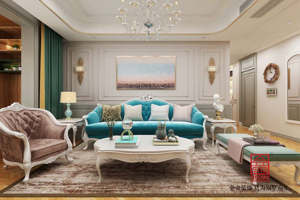 設計說明:此案例為石家莊金舍裝飾-東南智匯城126平米法式輕奢風格裝修效果圖。藍色系具有立體感的沙發顏色,使墻面很顯層次感;多彩的地毯、靈動設計的臺燈、不拘一格的掛畫,營造出一幅自由、溫馨、浪漫的氛圍;而客廳旁的落地窗給足了這間空間明亮的自然采光,用餐區域餐桌上方的水晶吊燈與客廳中的精致吊燈遙相呼應,讓整個空間之中都映射出一種浪漫氛圍,法式風格如同法國這個國家一樣,浪漫迷人,仿佛普羅旺斯的陽光,灑滿你的家。藍色調營造浪漫時尚法式風情,尋求心靈的自然回歸感;將法式傳統的三顏色與當季流行色融合,不失法式的貴氣和浪漫