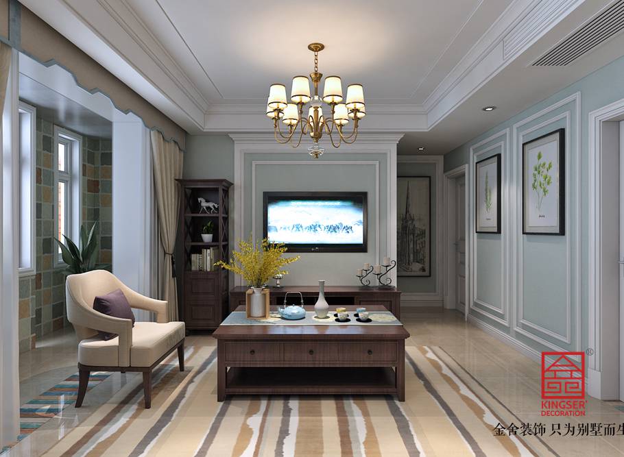 設計說明:此案例為石家莊裝修公司-國賓壹號108平米美式風格裝修效果圖。簡美風格的特色是將設計的元素、色彩、照明、原材料簡化到最少的程度。但是對材料的色彩質感要求很高。因此,簡約的空間設計非常含蓄,往往能起到以少勝多,以簡勝繁的效果。藝術創意宜簡不宜繁,宜藏不宜顯(齊白石語),這些都是對簡潔最精辟的闡述。簡約的美式風格,一般稱為簡美,少了雕花多了現代元素,在古典美式的基礎上,加入現代元素,以明晰的線條、得體有度的裝飾,讓家居空間既有美式的韻味又有現代的簡約感。