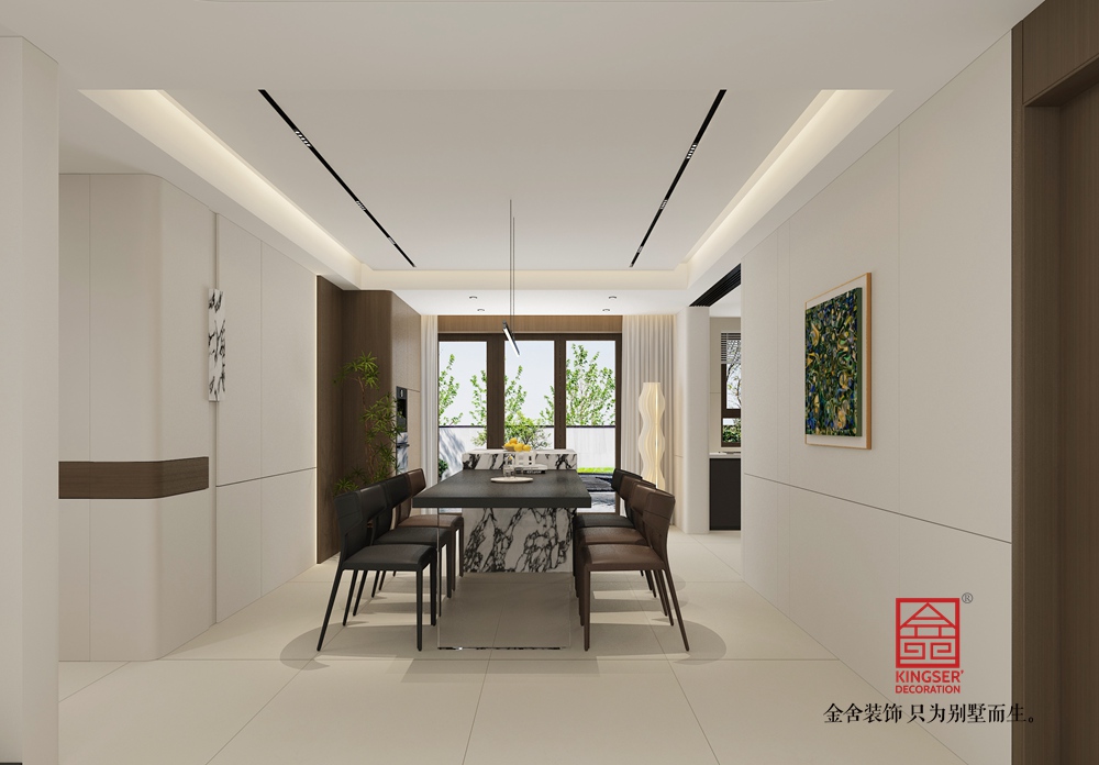 裝飾上,左側色彩絢麗的藝術畫作,為空間注入藝術活力;綠植與特色擺件的點綴,讓空間更顯生機與個性。充足的自然采光透過大窗涌入,結合精心設計的室內照明,使空間明亮通透。整體設計簡約卻不失格調,每一處細節都彰顯出對高品質別墅生活的用心營造。