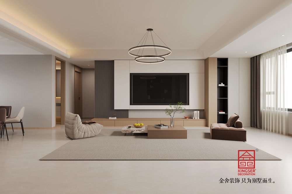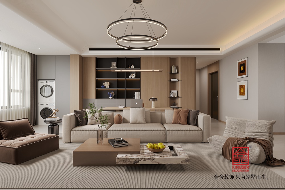 本客廳設計以現代簡約風格為核心,主打溫暖柔和的大地色系。空間布局上,將休閑與功能區巧妙融合,背景墻處的柜體設計,兼具收納與展示功能,燈光點綴更顯精致。家具選擇注重舒適與質感,淺米色大沙發搭配棕色系單品,營造出溫馨和諧的氛圍。雙層環形吊燈造型別致,為空間增添時尚感。整體通過材質、色彩與燈光的搭配,打造出一個舒適、雅致且充滿生活氣息的別墅起居空間。