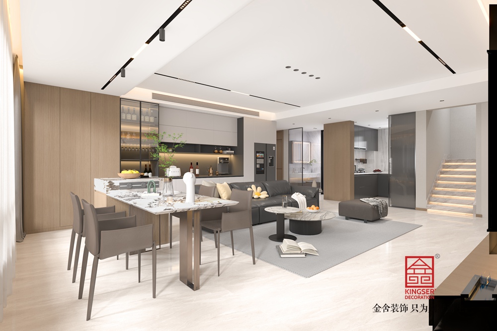 主色調(diào)以淺米色墻面為基底,搭配原木色地板與深灰色家具,形成低飽和度的和諧配色,既顯干凈清爽,又能適配多種軟裝風(fēng)格。