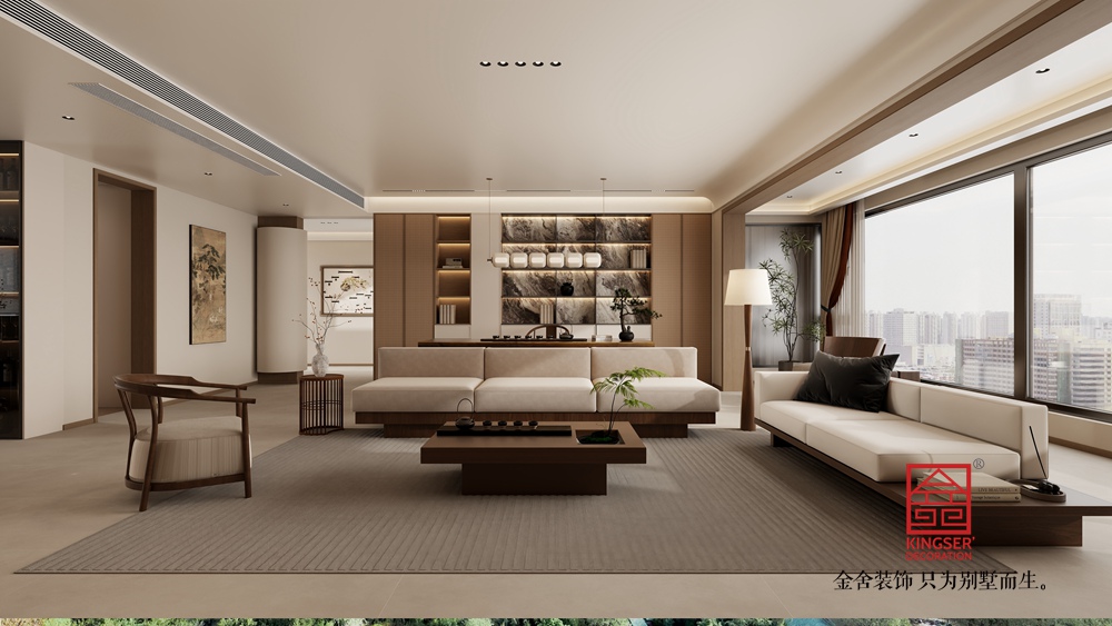 寬闊的落地窗引入充足自然光線(xiàn),搭配雅致的窗簾,讓室內(nèi)外景致交融。空間中點(diǎn)綴的綠植、中式擺件,以及墻上的簡(jiǎn)約裝飾,都為空間增添了文化氣息與自然意趣,打造出一個(gè)兼具實(shí)用性與美學(xué)價(jià)值,能讓人在現(xiàn)代生活中感受東方美學(xué)底蘊(yùn)的愜意居所。