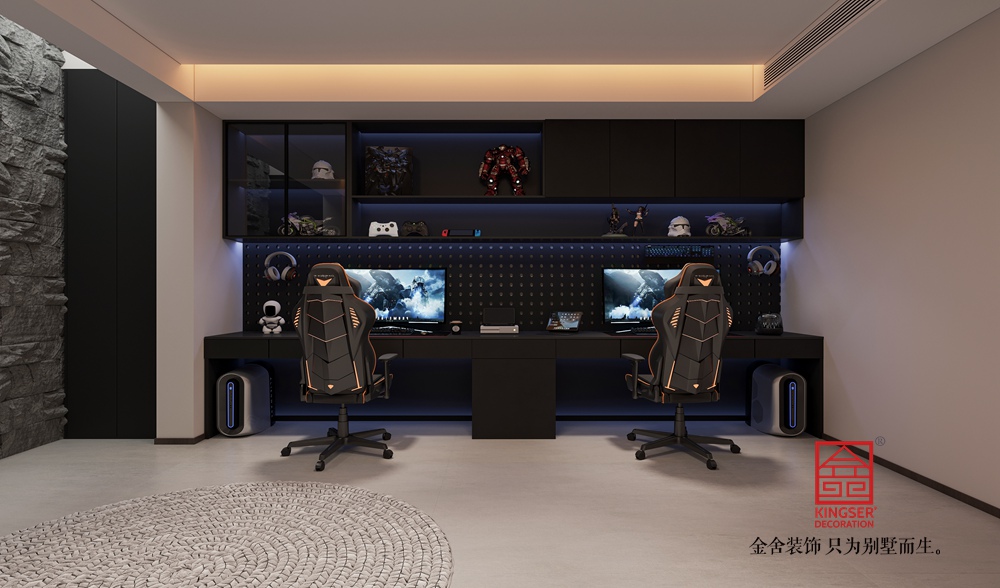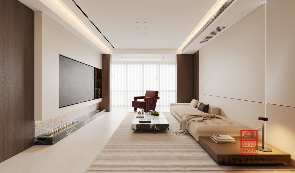 采用開放式布局,將觀影、休憩功能有機整合。線性燈光設計強化了空間縱深感,隱藏式燈帶與點光源結合,營造出柔和且富有層次的照明效果;大面積落地窗搭配百葉簾,保證采光的同時兼顧隱私,讓空間在通透與雅致間找到平衡。