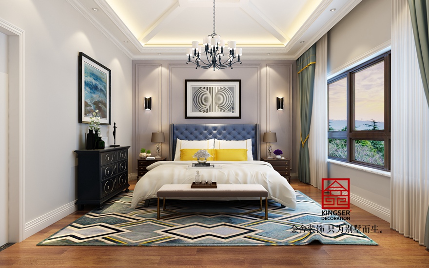 主臥在放高足夠的情況下采用了“回”字形吊頂,第二階的“口”字形造型把整個空間向上拉伸,顯得空間更加寬敞、高大。考慮到臥室的休息性,在色調上采用了淺灰色作為背景墻的主色調,即溫和又不會顯得沉悶,有助于提高業主的睡眠質量。經典的美式“三段式”’造型,沒有過多復雜邊線,簡潔干練,搭配頗有現代感的金屬燈飾及飾品,使整個空間簡而不失潔時尚。整體的方案圍繞清新的美式風格的簡單舒適,質樸典雅來設計,石家莊金舍裝飾設計師完美詮釋了業主的提出的“簡潔而不簡單”的沒事風格,也體現了業主對高品質生活的要求。
